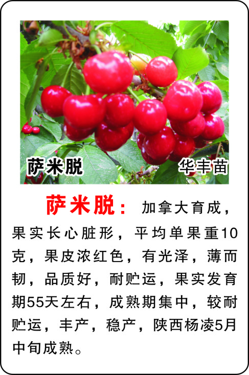 萨米脱樱桃苗:加拿大育成,果实长心脏形,平均单果重10克,果皮浓红色,有光泽,薄而韧,品质好,耐贮运,果实发育期55天左右,成熟期集中,较耐贮运,丰产,稳产,陕西杨凌5月中旬成熟。