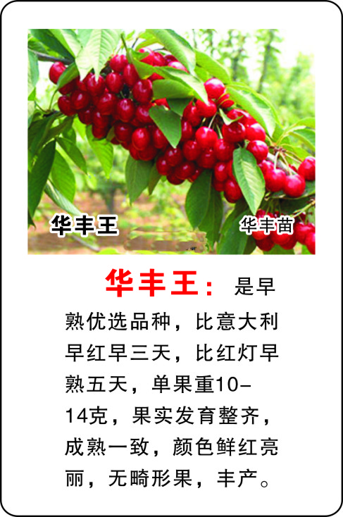 华丰王樱桃苗:早熟优选品种,比意大利早红早三天,比红灯早熟五天,单果重10-14克,果实发育整齐,成熟一致,颜色鲜红亮丽,无畸形果,丰产。