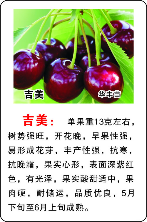 吉美樱桃苗:单果重13克左右,树势强旺,开花晚,早果性强,易形成花芽,丰产性强,抗寒,抗晚霜,果实心形,表面深紫红色,有光泽,果实酸甜适中,果肉硬,耐储运,品质优良。5月下旬至6月上旬成熟。